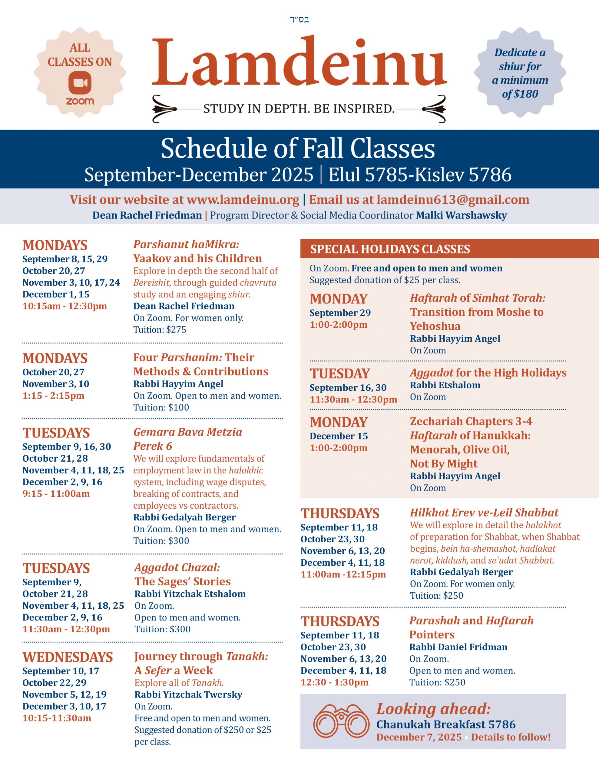 Lamdeinu is a center for high-level, accessible and inspiring Torah learning in Teaneck, New Jersey. It is housed in the beautiful Beit Midrash of Congregation Beth Aaron. Classes are given weekday mornings and afternoons, Monday through Thursday. There are lectures during the evening as well as Rosh Chodesh celebrations and other events.