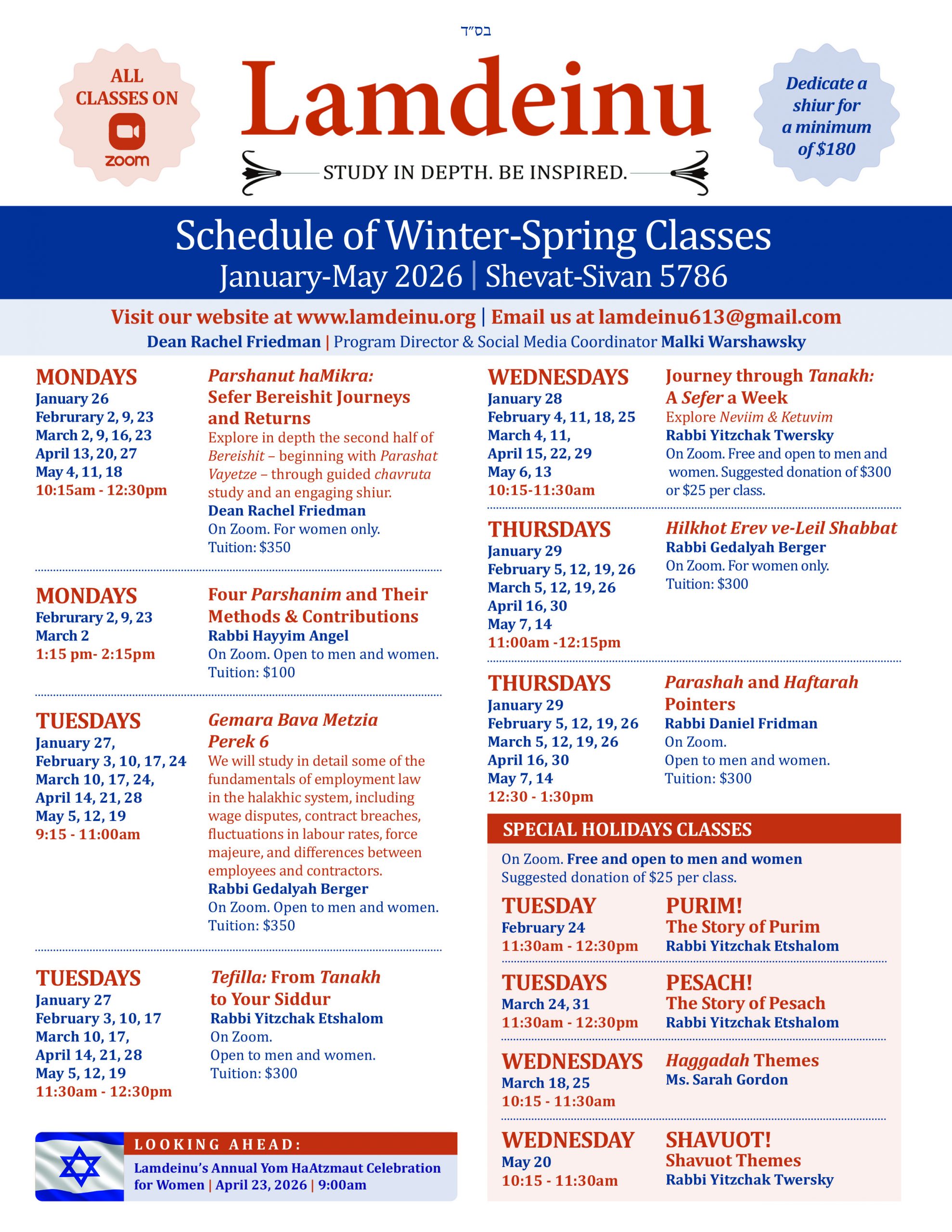 Lamdeinu is a center for high-level, accessible and inspiring Torah learning in Teaneck, New Jersey. It is housed in the beautiful Beit Midrash of Congregation Beth Aaron. Classes are given weekday mornings and afternoons, Monday through Thursday. There are lectures during the evening as well as Rosh Chodesh celebrations and other events.