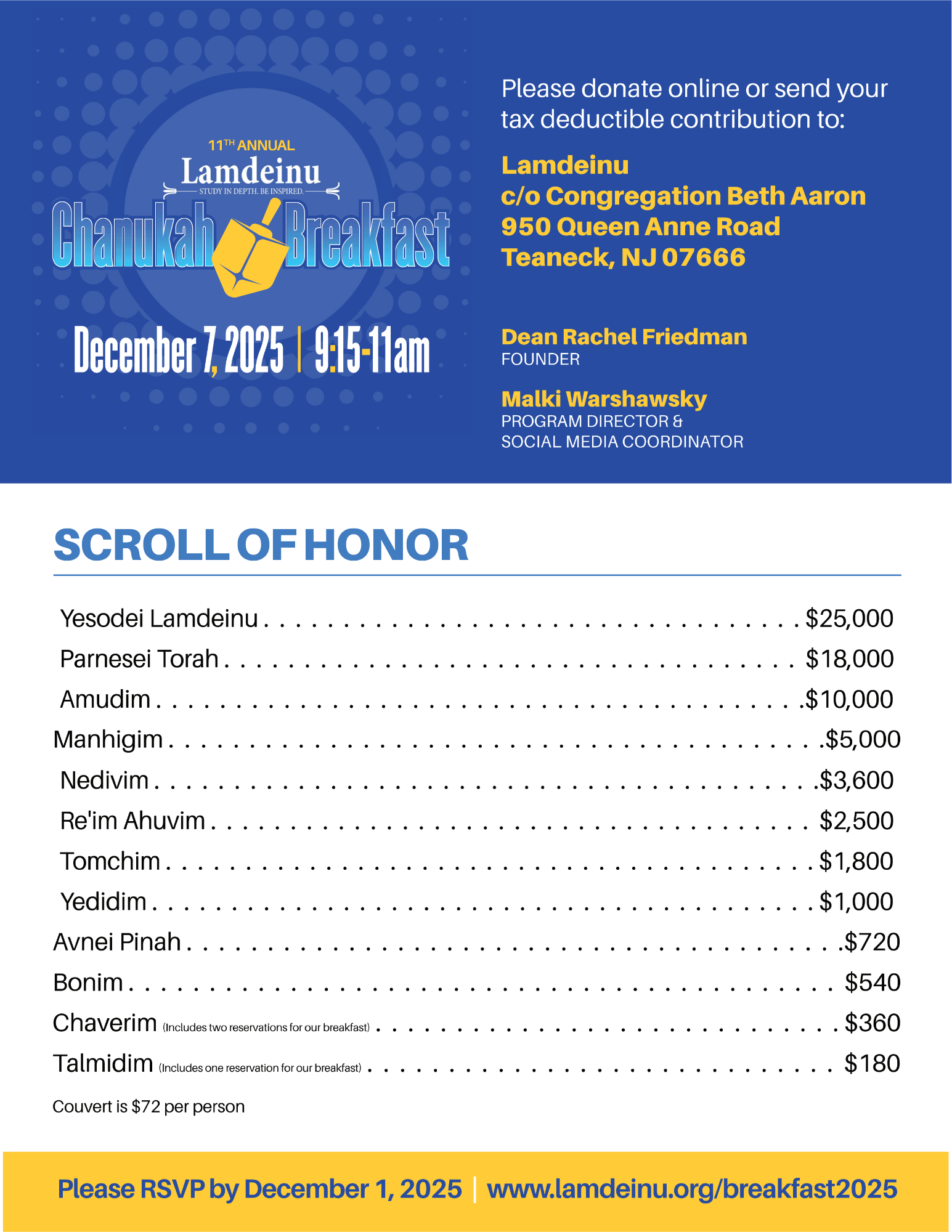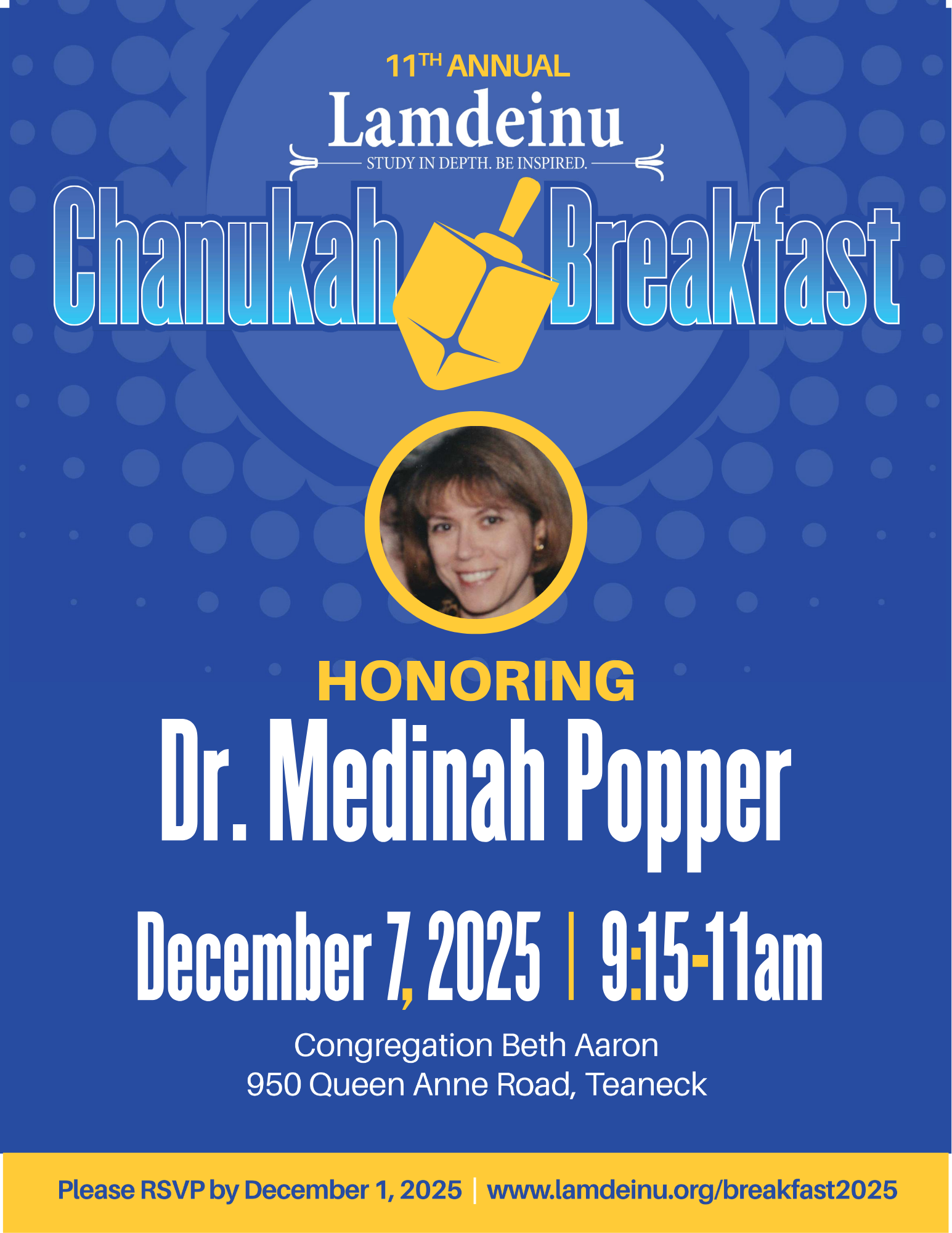 Please join Lamdeinu’s Eleventh Annual Chanukah Breakfast on Sunday morning December 7th at 9:15 am at Congregation Beth Aaron in Teaneck as we honor Dr. Medinah Popper. Please support the incredible work that Lamdeinu does throughout the year!